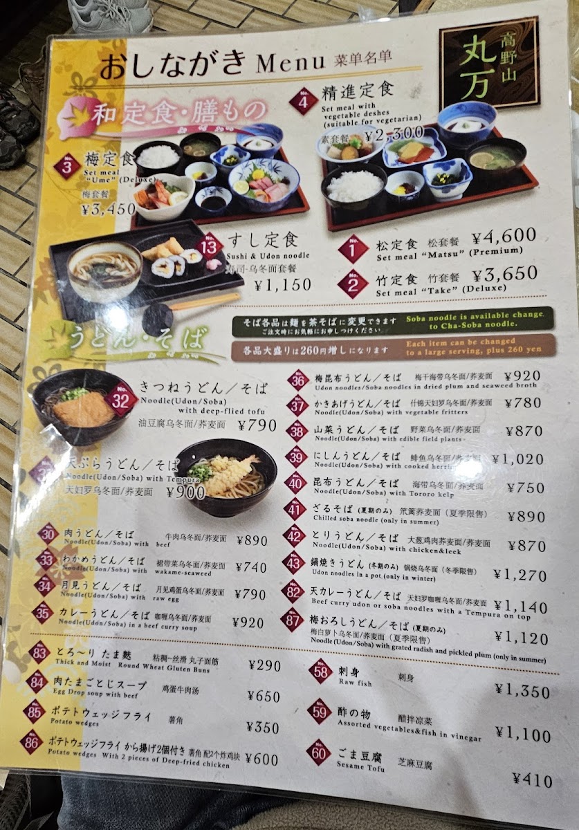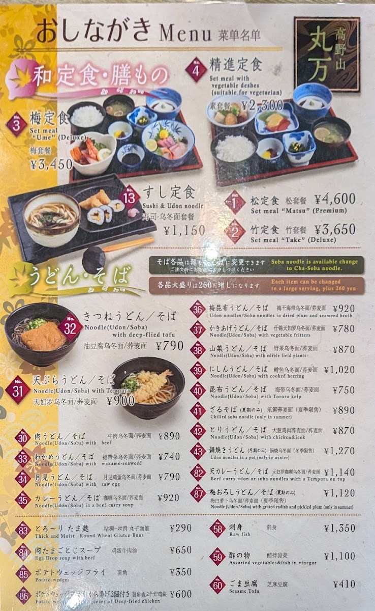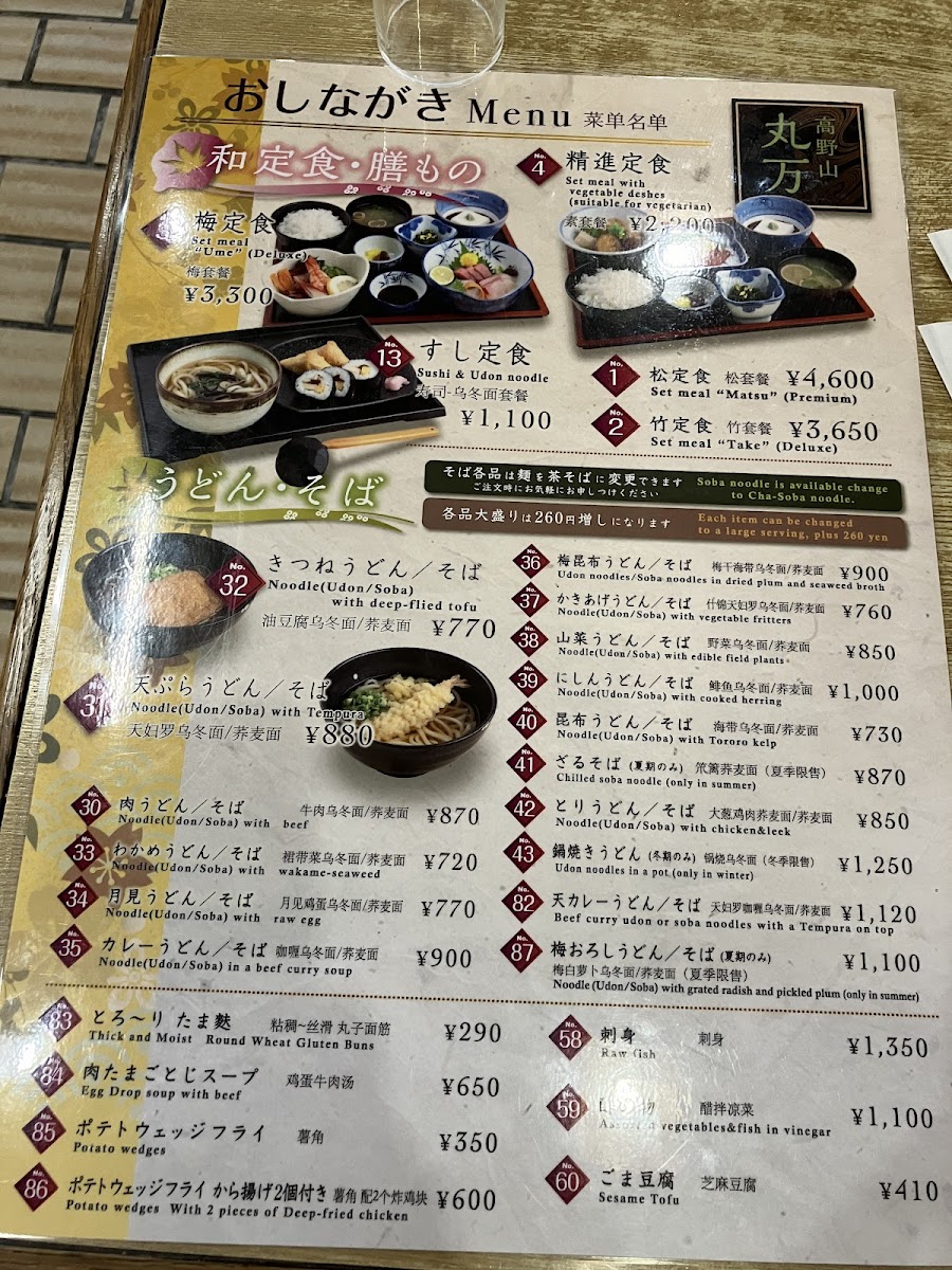The menu at Maruman reflects a straightforward, comforting dining experience that blends the essence of traditional Japanese meals with the casual atmosphere of a local syokudo. Guests can expect a variety of carefully prepared set meals and noodle dishes, designed to suit relaxed lunches or unhurried dinners during a day of exploring Koyasan.